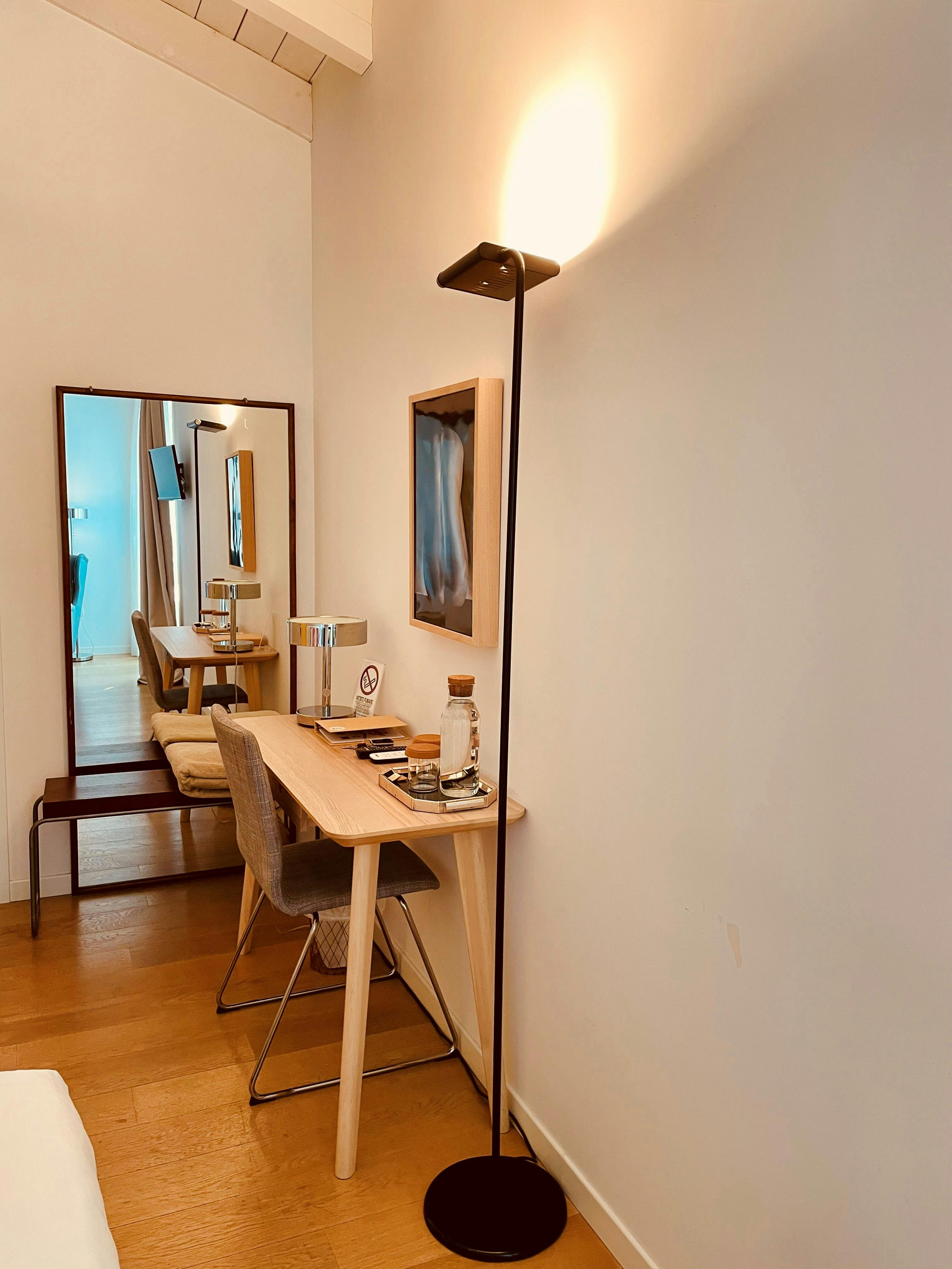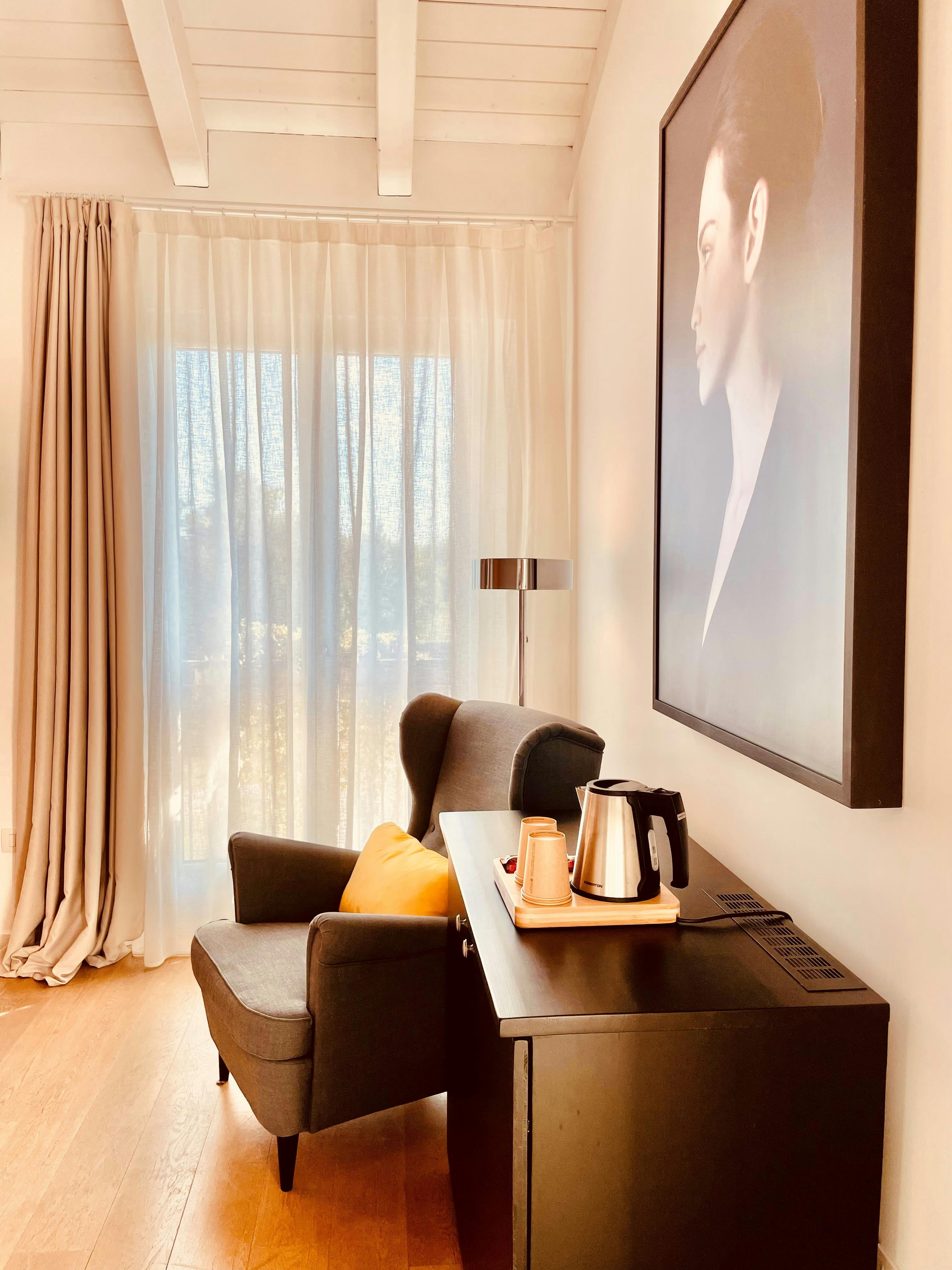 Erdtönen charakterisieren dieses Doppel-Zweibettzimmer. Es ist mit einem Schreibtisch, TV mit Satellitenkanälen, einen Kühlschrank, Klimaanlage und einem gemütlichen Sessel ausgestattet. Es verfügt über ein eigenes Bad mit einer geräumigen Dusche, einem Haartrockner und kostenlosen Toilettenartikeln.