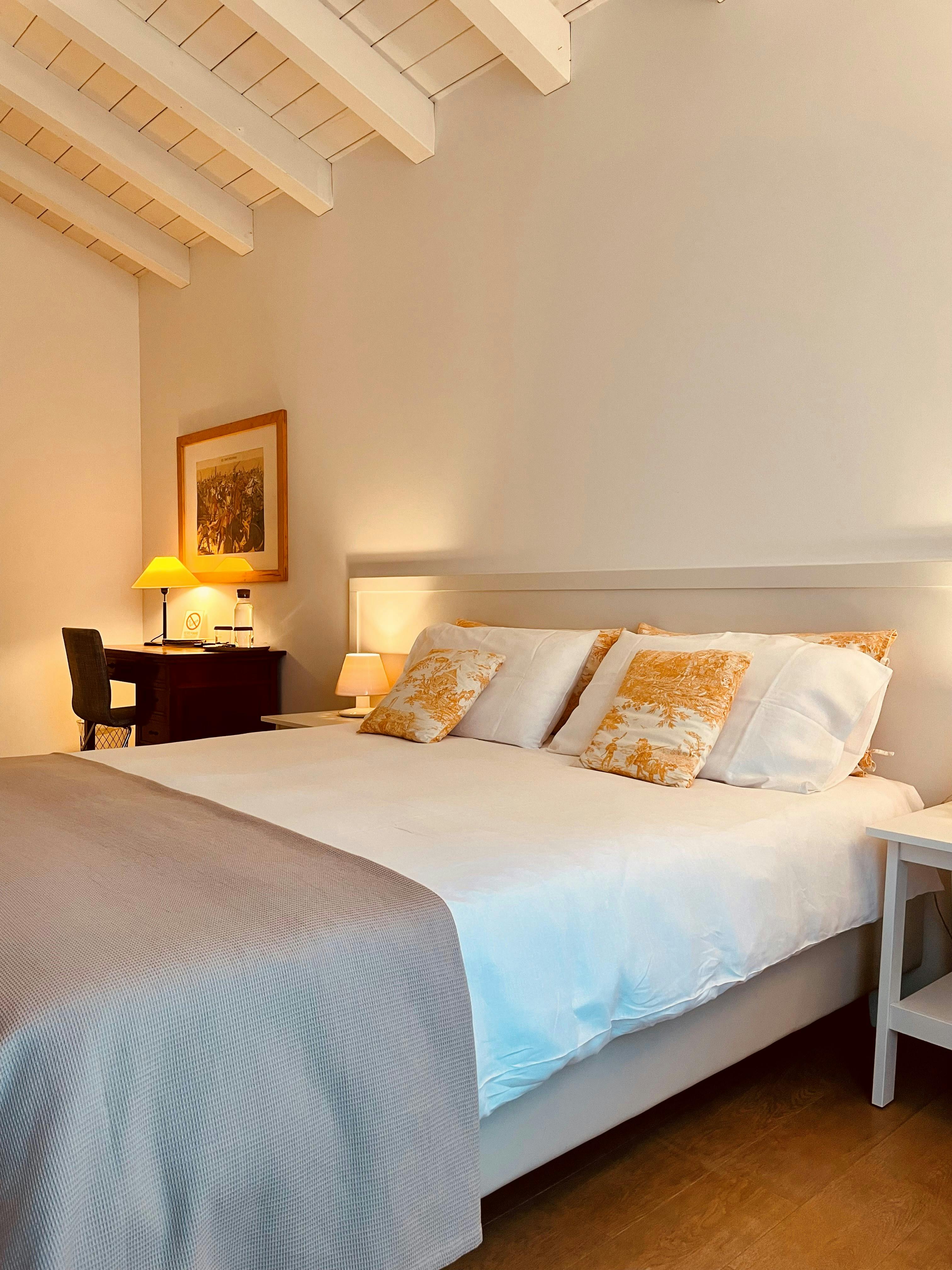 La suite. Nei toni azzurri del cielo questa spaziosa camera offre un ampio letto matrimoniale/ doppio singolo. È dotata di scrivania, frigorifero, televisione a schermo piatto con canali satellitari, climatizzatore, poltrone per il relax con vista sul giardino e la piscina. Ha un bagno privato con una grande doccia, asciugacapelli e prodotti per l’igiene in omaggio.